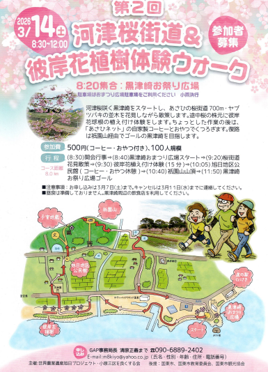 「河津桜街道&彼岸花植樹体験ウォーク」が3月14日、黒津崎お祭り広場(国東町黒津崎)発着で行われる。