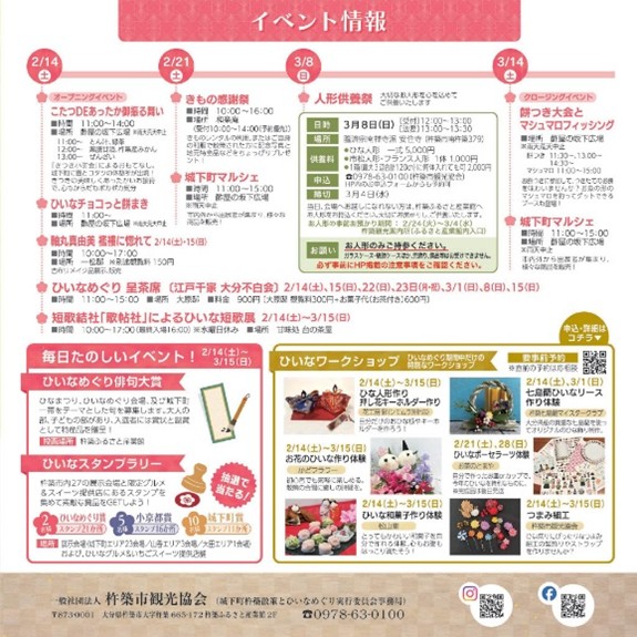 杵築市では、ひな人形を「小さくてかわいらしい」という意味を持つ古語にちなみ「ひいな」と呼ぶ風習が残る。城下町エリア、山香エリア、大田エリアの3エリア・計30会場で、江戸時代の古今びなや手作りびななど、趣の異なる「ひいな」を展示する。