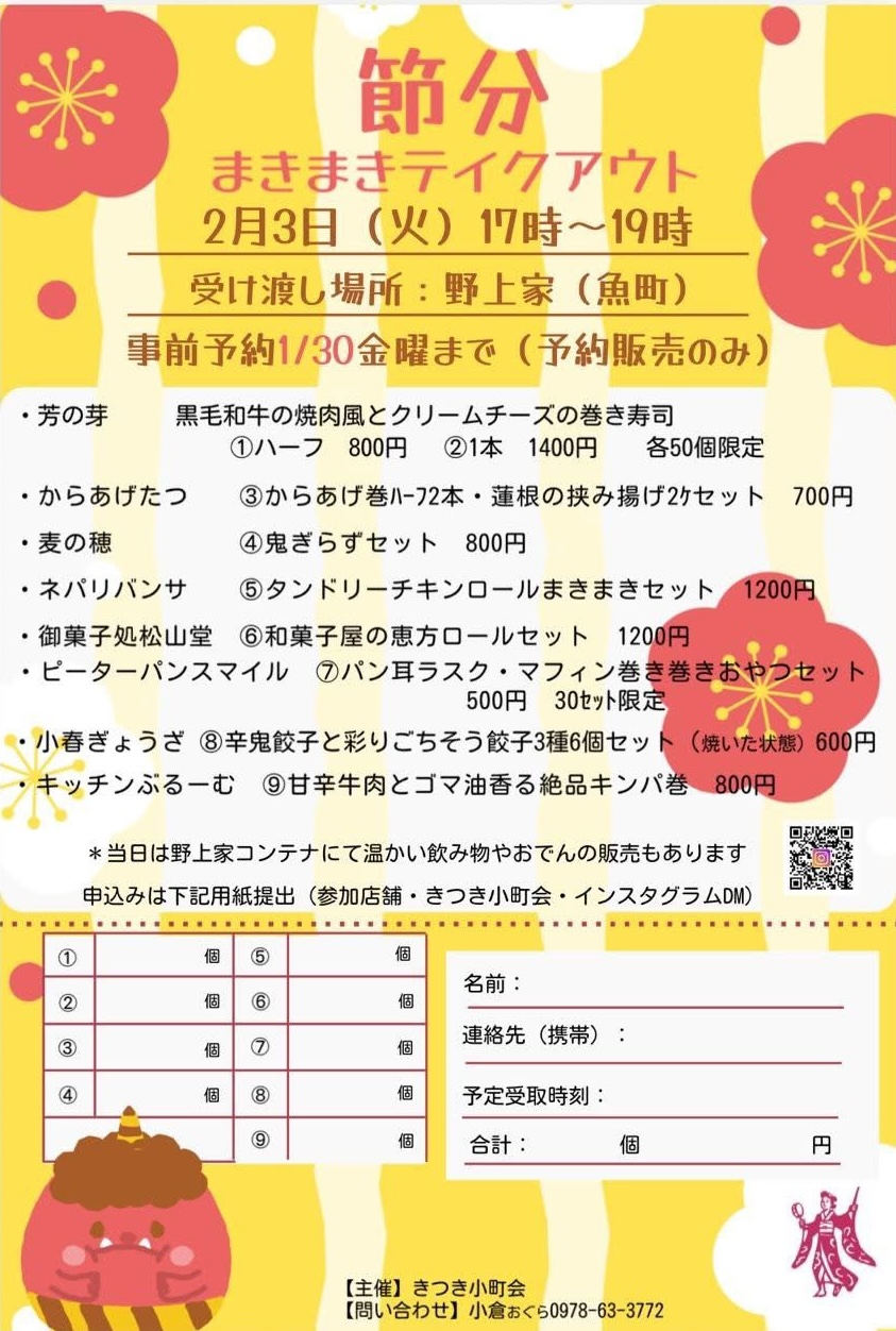 杵築市内の飲食店8店が出店する「節分まきまきテイクアウト」で販売する恵方巻きの予約受け付けが1月3日に始まった。